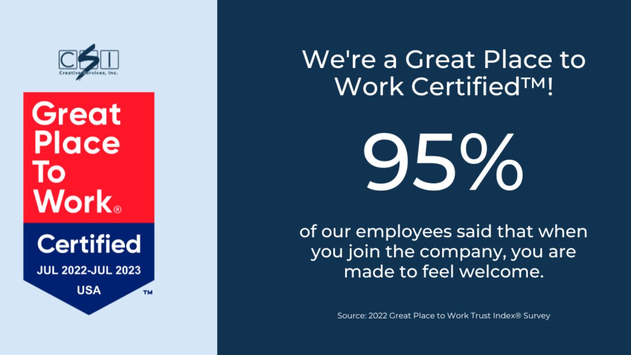 When you work with CSI, you’ll immediately sense a difference, and it comes from our entire team of satisfied and self-motivated employees. Says CSI President Alan Sklar, “We are honored to become Great Place to Work-Certified for the second year in a row. At CSI we consider employee experience a top priority every day. We owe our continued success to our team of dedicated employees at CSI. We celebrate and thank them for all they do to earn this incredible recognition.”